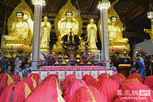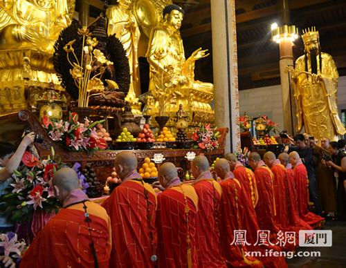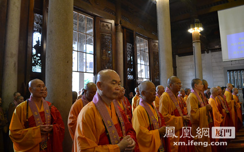6月14日早上,闽台佛教文化交流周系列活动之两岸和平祈福法会在厦门南普陀寺大雄宝殿隆重举行。